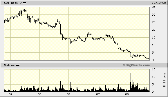 In May 2006, Cott’s board pushed out its CEO, John Sheppard, who had built EBITDA to roughly $200 million through acquisitions and a focus on efficient manufacturing, and brought in a new CEO, Brent Willis, to execute the new plan. From then until March 2008 when Willis departed, Cott’s stock dropped from $15 to $2 per share, wiping out nearly $1 billion of equity value. Today, it trades at around $1.00 per share, less than tangible book value. As I explain below, this could be an $8.00 stock if the company successfully implements its plan to cut costs and return to its roots. But it is a long, long way from here to there. If the company does not get capable leadership soon, it may never get there.