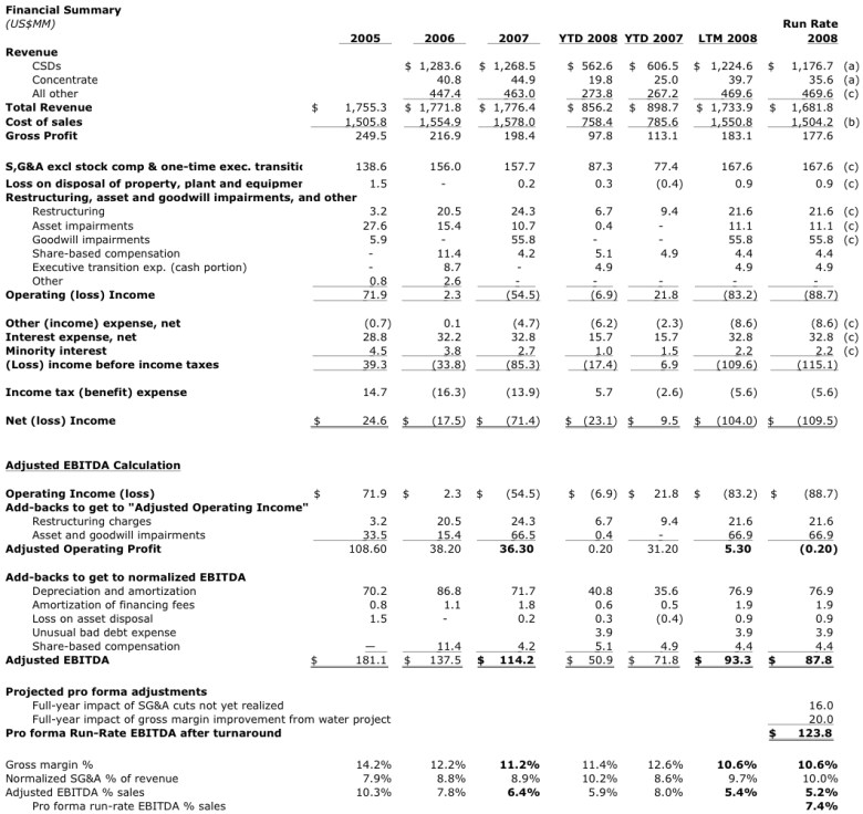 With debt approaching 5x run-rate EBITDA – and 8x run-rate EBITDA less normalized CapEx[1] – the company’s balance sheet may force some sort of recapitalization, or reorganization, before the company is able to execute this plan. Cott’s $269 million of 8% Senior Subordinated Notes are due in just over three years. Its new ABL facility ($131 million drawn as of 6/28/08 ) also comes due at that time if the 8% Notes are not refinanced before then. The 8% Notes, which were recently downgraded by both S&P and Moody’s and trade at a significant discount, will not be easy to refinance.